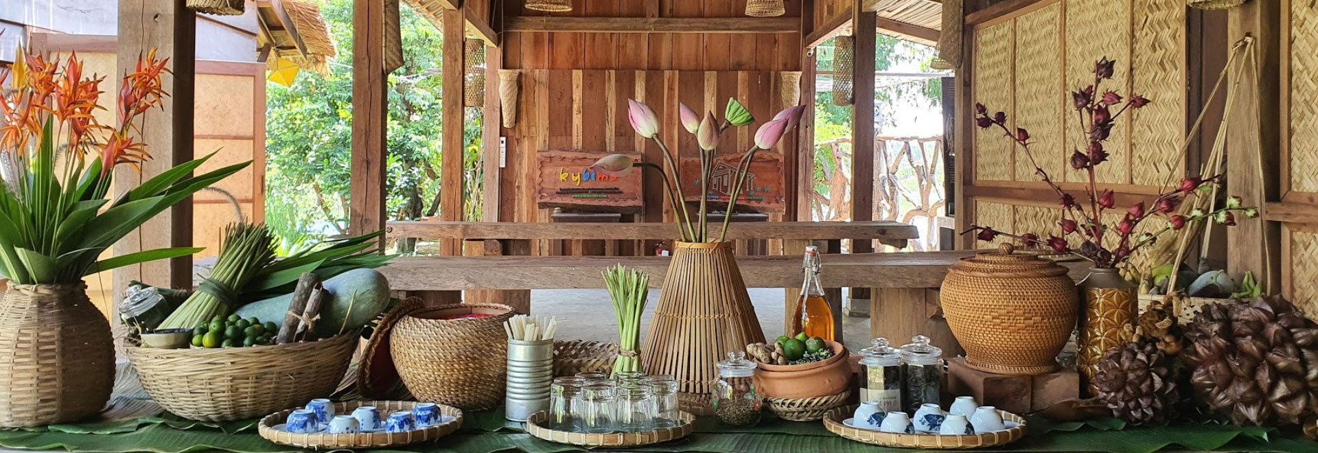 Cụm nhà gỗ tại vườn KyBiMơ mang nét kiến trúc văn hóa truyền thống đặc trưng. Lưu giữ lại không gian thoảng hồn quê, mang đến cho quý khách sự thư thái, an nhàn. Thiết kế theo hệ thống kèo chống trụ. Mang đặc trưng là các thanh kèo đặt nằm nghiêng theo chiều dốc mái nhà, từ đó liên kết các đầu cột lại với nhau. Đầu thanh kèo phía dưới gác lên đuôi thanh phía trên. Cũng bởi vì sự liên kết độc đáo đó mà người ta còn có tên gọi khác đó là “nhà kèo”.