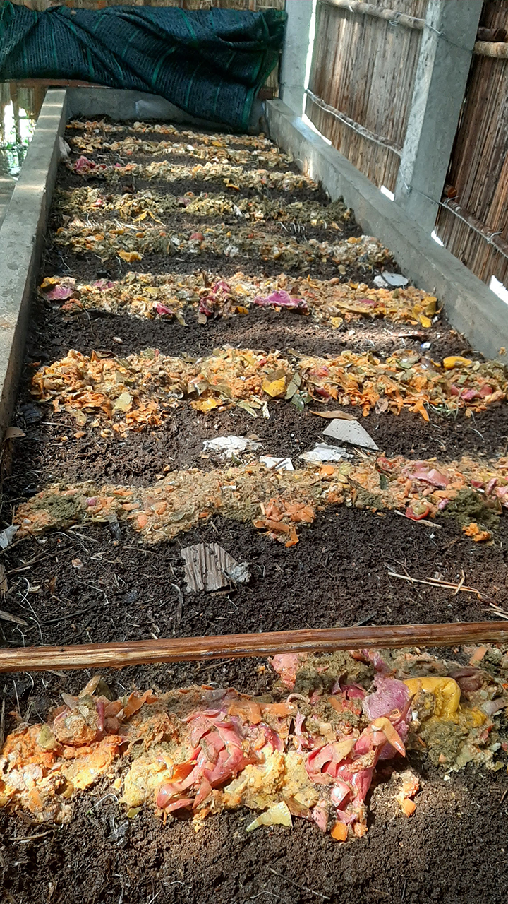 Rác dễ phân hủy phát sinh từ hoạt động kinh doanh sẽ được thu gom, phân loại -> ủ làm nguồn thức ăn nuôi trùn quế -> sản sinh ra dịch trà trùn và phân -> bón cho rau, hoa màu tại vườn rau hữu cơ KyBiMơ; tạo thành chuỗi tuần hoàn để giảm thiểu thải ra môi trường và tái sử dụng rác thành tài nguyên.