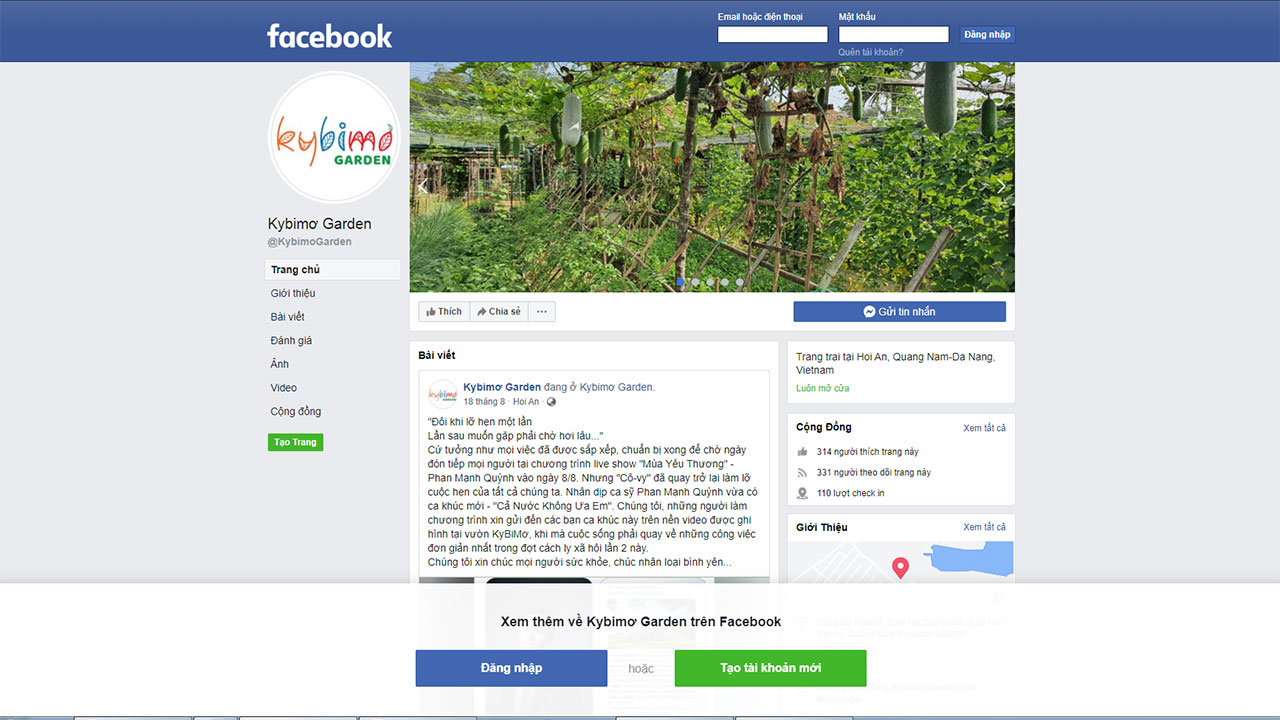 Hãy truy cập vào Facebook của bạn và nhấn vào biểu tượng “Yêu Thích” trên fanpage “KyBiMo Garden” (https://www.facebook.com/KybimoGarden/). Nơi mà chúng tôi sẽ cung cấp và cập nhật thông tin hằng ngày về những loại nông sản mà chúng tôi đang thu hoạch. Đặc biệt hơn, các bạn có thể yêu cầu cung cấp và giao hàng trực tiếp trên fanpage của chúng tôi.