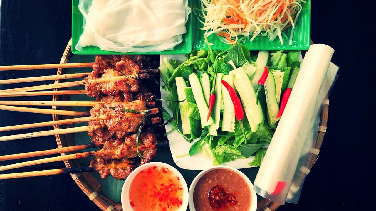 Các món ăn được phục vụ trên một khay bao gồm một chồng bánh gạo ướt, xiên thịt lợn nướng than, một món rau và rau tươi, và nước sốt đậu phộng như một món nhúng.